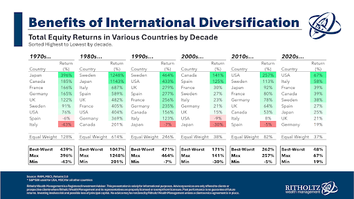 We can broaden our perspective and consider the merits of international investment. I also believe in international diversification as there is no certainty that the U.S. stock market will continue its past 15-year success into the next 15 years. Indeed, the U.S. stock market has been a clear winner in the last decade and a half, but as indicated by the chart, the leading markets shift with each decade. Each decade presents its own set of top and bottom performers, with significant disparities between them. The recent dominance of U.S. stocks could indicate a global market paradigm shift or simply be a case of recency bias—a common investor bias that attributes greater importance to recent events or what can quickly be recalled while minimizing the significance of long-term trends. Many overlook the previous U.S. stock market downturn from 2002–2009, when the market declined nearly 10%, or the booming Japanese stock market of the 1980s, which, after attracting global investments, crashed in the 90s and stagnated for three decades. In the 1970s and 80s, U.S. stocks were nearer the bottom than the top. However, the evident pattern is that alternating cycles of U.S. and international market superiority are a normal phenomenon.