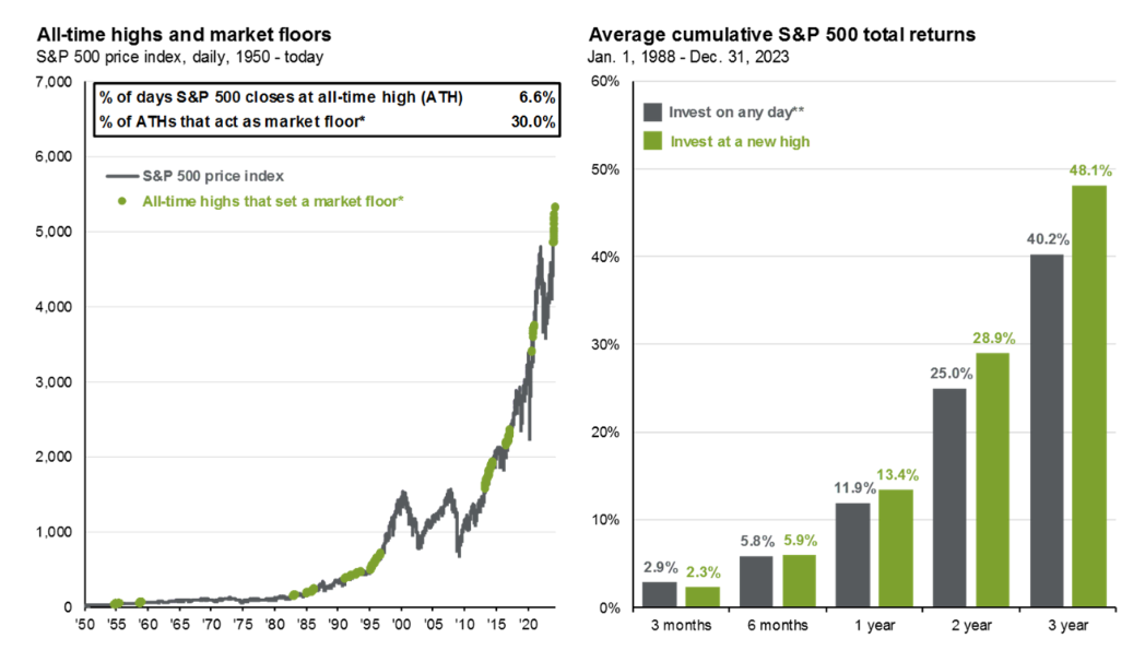 There’s no time like the present - I often hear clients say they prefer to wait for a better time to invest in the stock market because it is at an all-time high. Contrary to popular belief, investors are actually better off buying when the market is at new highs. According to JP Morgan, the average returns for investors who put their money to work at a new all-time high are about 8% higher per year than for those who invest on any other day after three years' time.